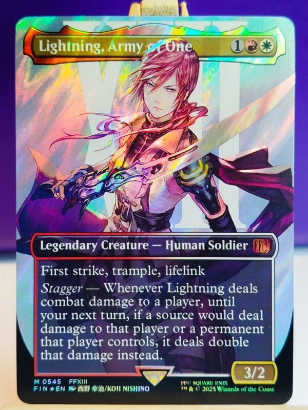 Les cartes Surge Foil se distinguent par un procédé de fabrication particulier, où l’effet foil est appliqué manuellement. Contrairement aux finitions industrielles classiques, chaque carte est travaillée individuellement, ce qui crée des variations naturelles dans les motifs, l’intensité et les reflets. Aucune Surge Foil ne ressemble parfaitement à une autre.
